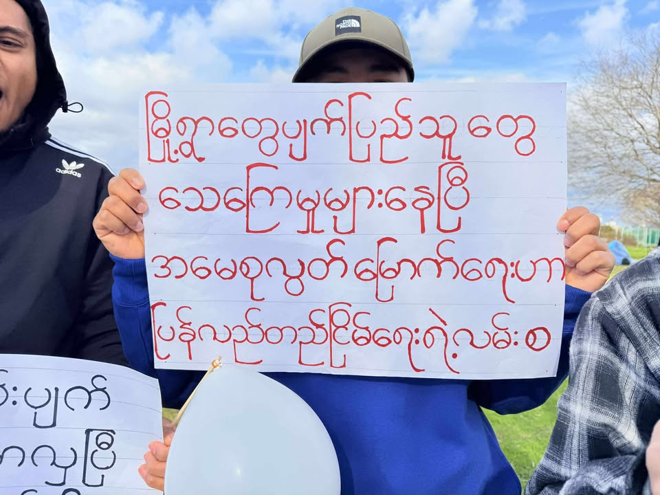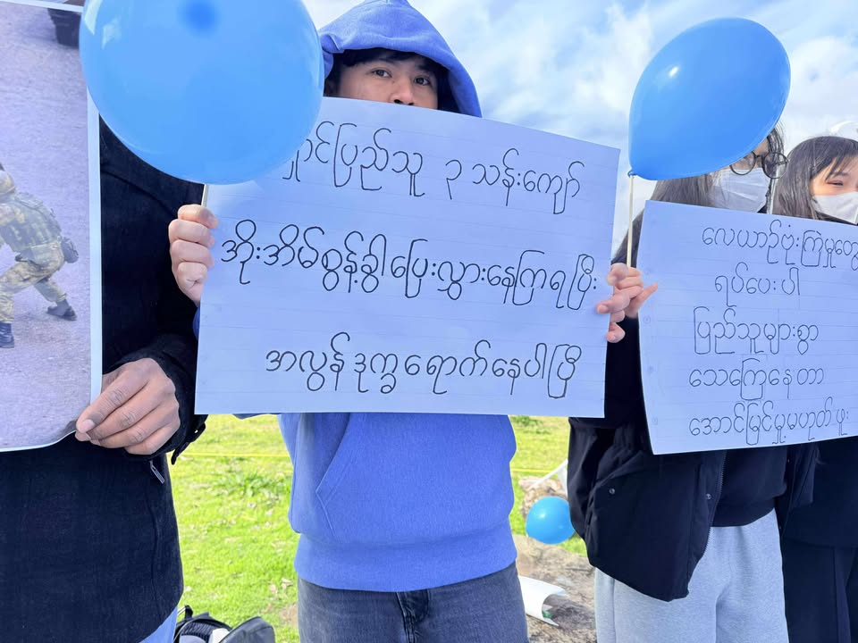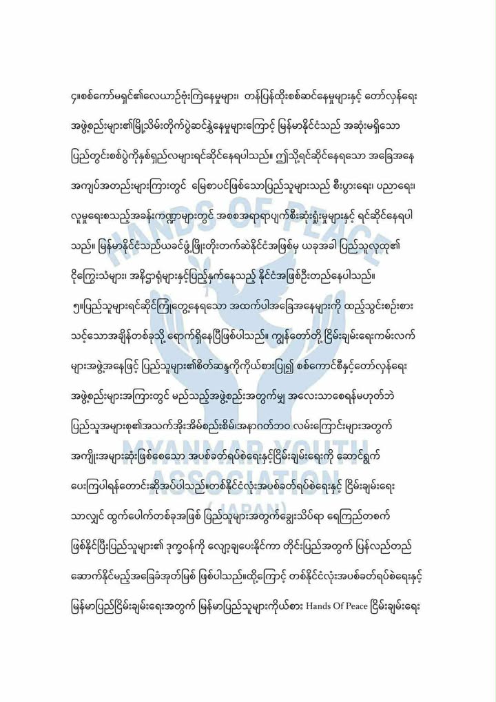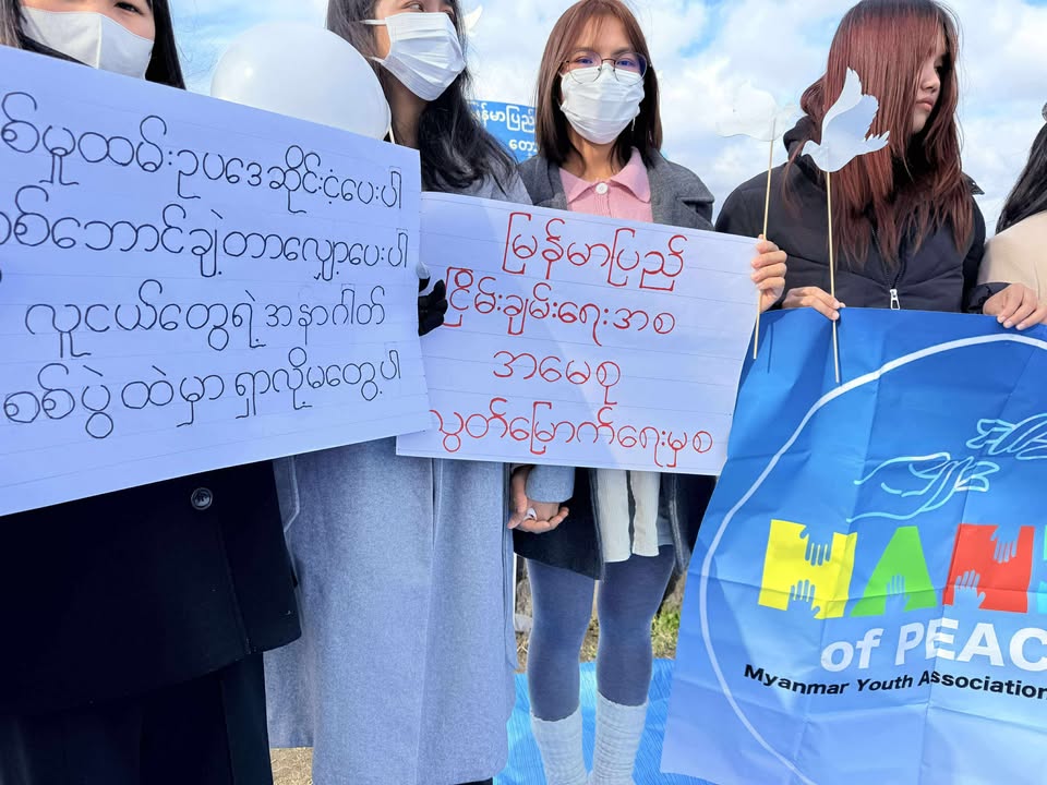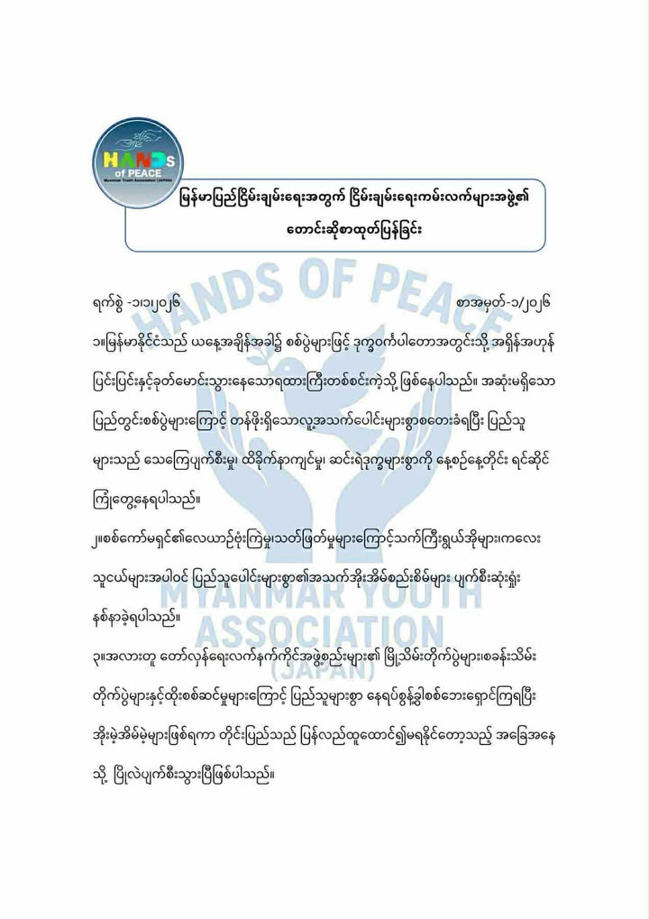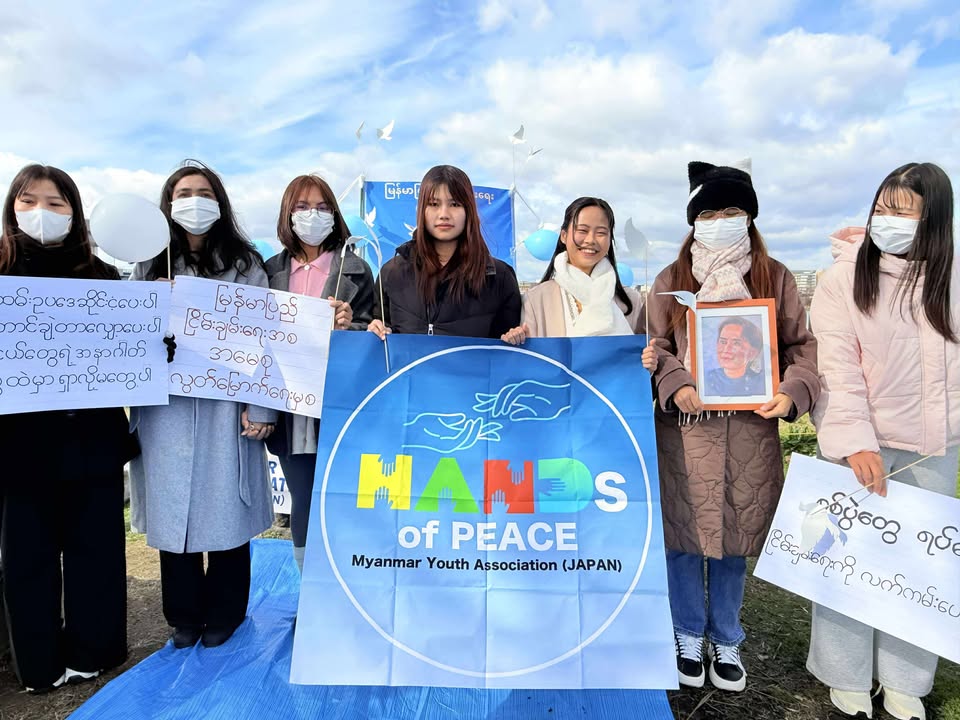 အာဏာသိမ်းစစ်တပ်အနေဖြင့် လေကြောင်းတိုက်ခိုက်မှုများရပ်တန့်ရန်၊ ဒေါ်အောင်ဆန်းစုကြည်နှင့် နိုင်ငံရေးအကျဉ်းသားများလွှတ်ပေးရန်အချက်များအပါအဝင် အားလုံးပါဝင်သည့် ငြိမ်းချမ်းရေးဆွေးနွေးပွဲများစတင်ရန်အတွက်ဟုဆိုကာ Hands Of Peace ငြိမ်းချမ်းရေးကမ်းလက်များအဖွဲ့က ဂျပန်နိုင်ငံ အိုဆာကာမြို့မှာ ယနေ့ နံနက် (၁၀) နာရီတွင် ငြိမ်းချမ်းရေးတောင်းဆိုပွဲ လှုပ်ရှားမှု ပြုလုပ်ခဲ့သည်။